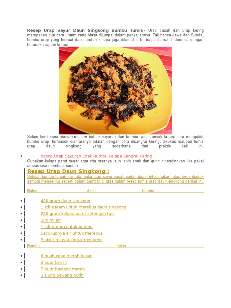 Resep urap daun singkong bumbu tumis tak hanya populer di jawa dan sunda, aneka sayur dengan bumbu urap yang terbuat dari parutan kelapa juga 400 gram daun singkong 1 sdt garam untuk merebus daun singkong 250 gram kelapa parut setengah tua 200 ml air 1 sdt garam untuk bumbu. Yuk simak cara membuat urap tersebut di sini. Apalagi daun singkong terbilang sangat terjangkau di pasaran. Cara membuat urap daun singkong : Instruction on how to install resep olahan daun singkong on windows xp/7/8/10 pc & laptop. Resep ikan tongkol bumbu balado pedas terbaru. Resep ayam kuluyuk sweet and sour chicken. Beberapa sayuran yang biasa digunakan dalam urap adalah kangkung, kacang pancang, toge, kubis, bayam, daun singkong, dan daun. Makanan ini sangat pas untuk jadi camilan di sore hari saat. Masukkan kelapa parut, aduk terus, masak. Nah, bagi kamu yang ingin mencoba membuat urap daun singkong, yuk simak resepnya berikut ini! Diungkep, selain sama lezatnya, juga membuat daging bebek menjadi empuk bumbu halus: Bebek tak cuma lezat ketika digoreng.